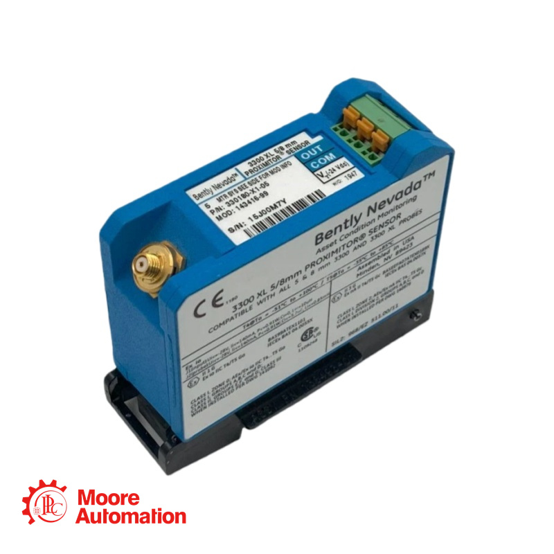 330180-X1-05 MOD:163339-01 is a 3300 XL Proximitor Sensor, with a non‑standard length and mounting configuration (X1), CSA, ATEX, IECEx Approvals (05). |