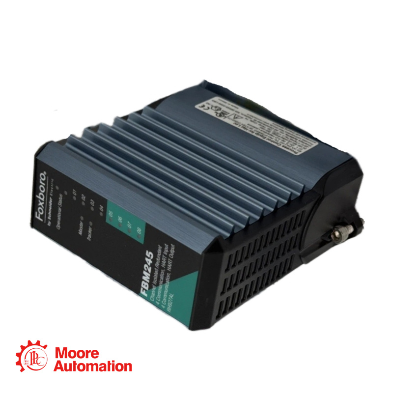 The FBM245 RH927AL is a redundant-capable I/O module that interfaces electrical input/output signals from field sensors and actuators to the redundant module Fieldbus. Each module contains four 0 to 20 mA galvanically isolated analog input channels and four 0 to 20 mA galvanically isolated analog output channels (eight total). When configured as a redundant pair, operation continues through replacement of a suspect module.
