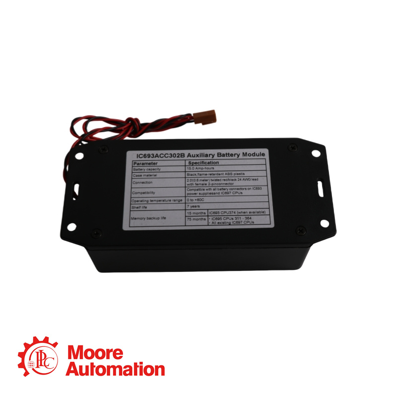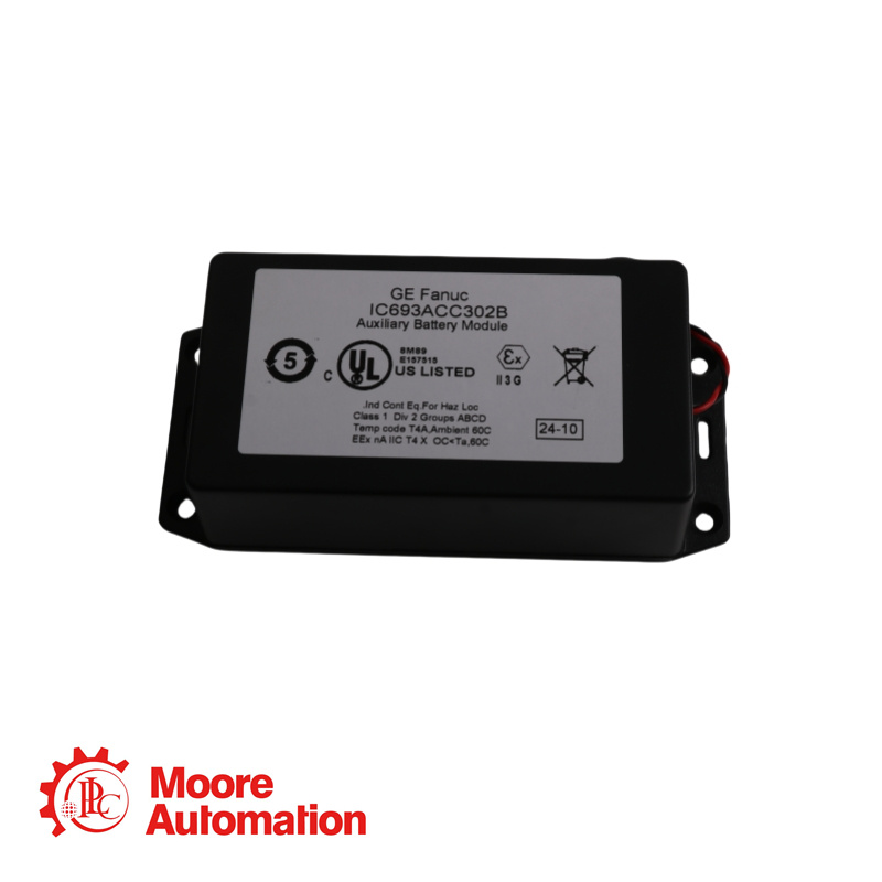IC693ACC302B is een door GE ontwikkelde hulpbatterijmodule. Deze maakt deel uit van het Mark I en II besturingssysteem. De hulpbatterijmodule is een component die is ontworpen om de geheugenback-uptijd te verlengen voor diverse GE besturingssystemen, waaronder de Series 90-30, Series 90-70 en PACSystems CPU's. Deze hulpbatterij vervangt de standaard RAM-back-upbatterij voor CPU's en verlengt de geheugenduur aanzienlijk zonder externe voeding.