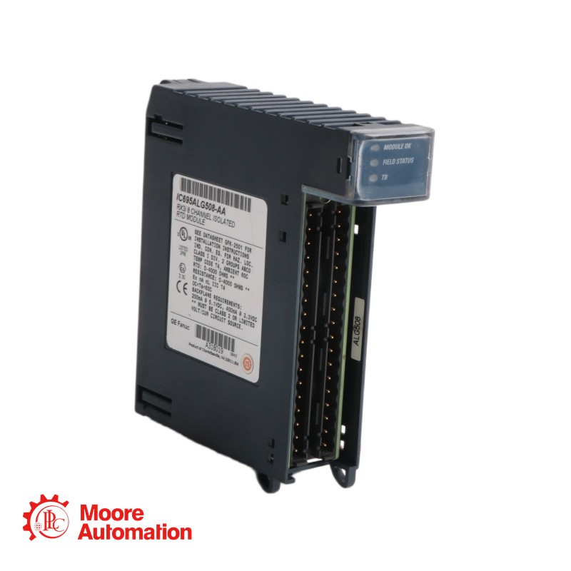The IC695ALG508 is a PACSystem RX3i Programmable Automation Controller (PAC) Resistance Temperature Detector (RTD) Input module formerly manufactured by GE Intelligent Platforms (GE IP) now under Emerson Automation. This module features Eight (8) isolated, differential RTD input channels. Each channel of this module supports Platinum 385, Platinum 391.6, Nickel 672, Nickel 618, Nickel-Iron 518, Copper 426. It is also compatible for direct resistance inputs such as 0-260, 0-525, 0-1050, 0-2100, 0-3150, 0-4200 ohms.