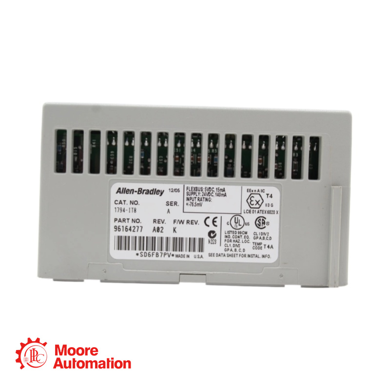 The 1794-IT8 is a FLEX I/O module designed to interface with a wide range of thermocouples and millivolt-level signals. It provides 8 independent input channels, converting analog temperature or voltage signals into digital data for communication with a programmable controller. This module is ideal for distributed I/O applications requiring cost-effective temperature monitoring without the need for high-speed response or extreme precision. It supports both grounded and ungrounded thermocouples when proper installation guidelines are followed. Communication is typically handled through block transfer reads/writes via the FLEX I/O adapter. |
