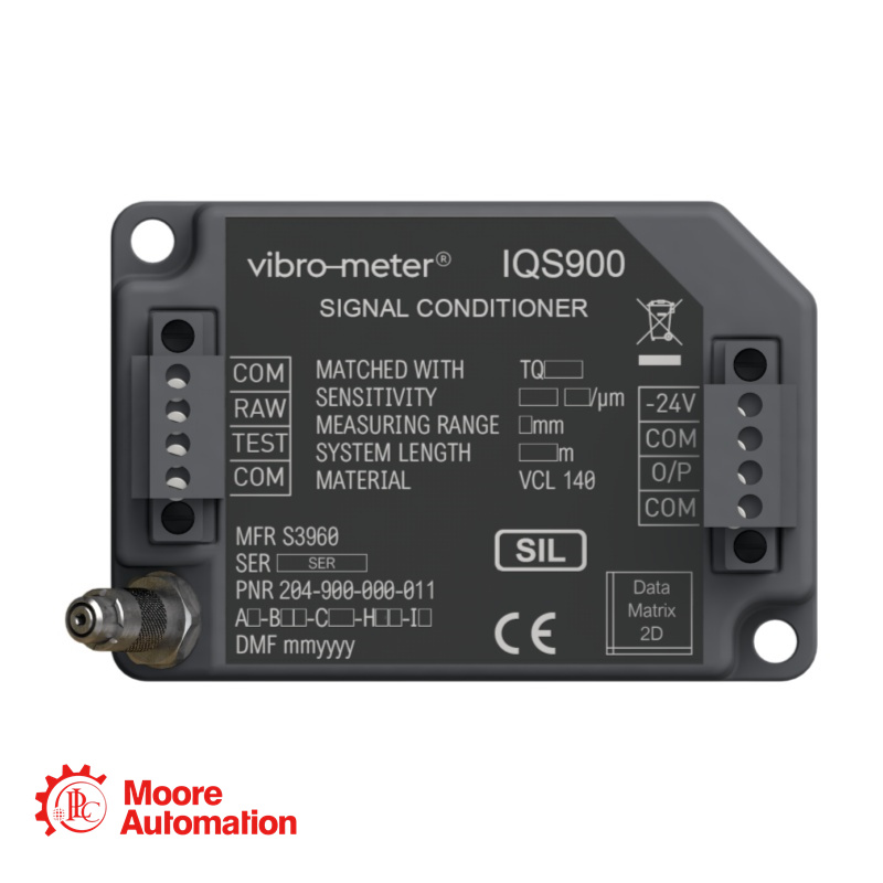 The IQS900 signal conditioner is designed for operation with vibro-meter TQ proximity sensors, that is, non-contact proximity sensors / measurement chains based on the eddy-current principle. The IQS900 signal conditioner provides a dynamic output signal – current (−15.5 to −20.5 mA) or voltage (−1.6 V to −17.6 V) – suitable for advanced condition monitoring applications that require spectral analysis, for example, machinery analytics and diagnostics.